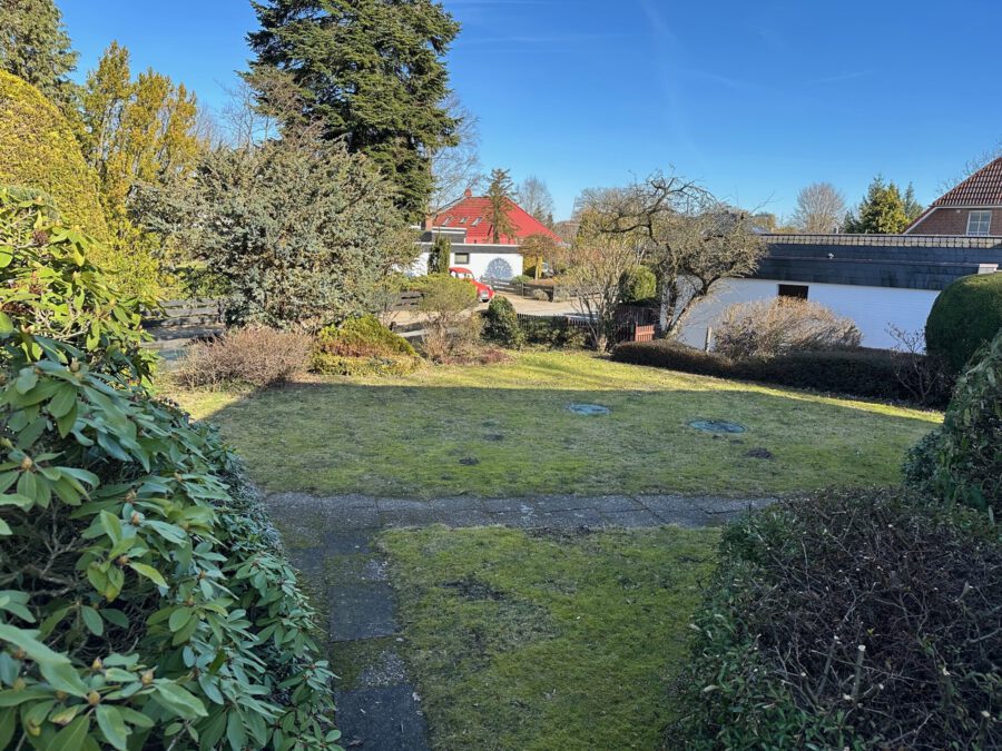 Das ca. 857m² große Grundstück ist rechtwinklig geschnitten und liegt in einer Sackgasse ohne Durchgangsverkehr. Zu dem Grundstück gehört eine Garage, die Zuwegungen sind gepflastert. Der Garten ist größtenteils als Rasenfläche, umrahmt von Beeten mit Büschen, Sträuchern und Bäumen, angelegt.