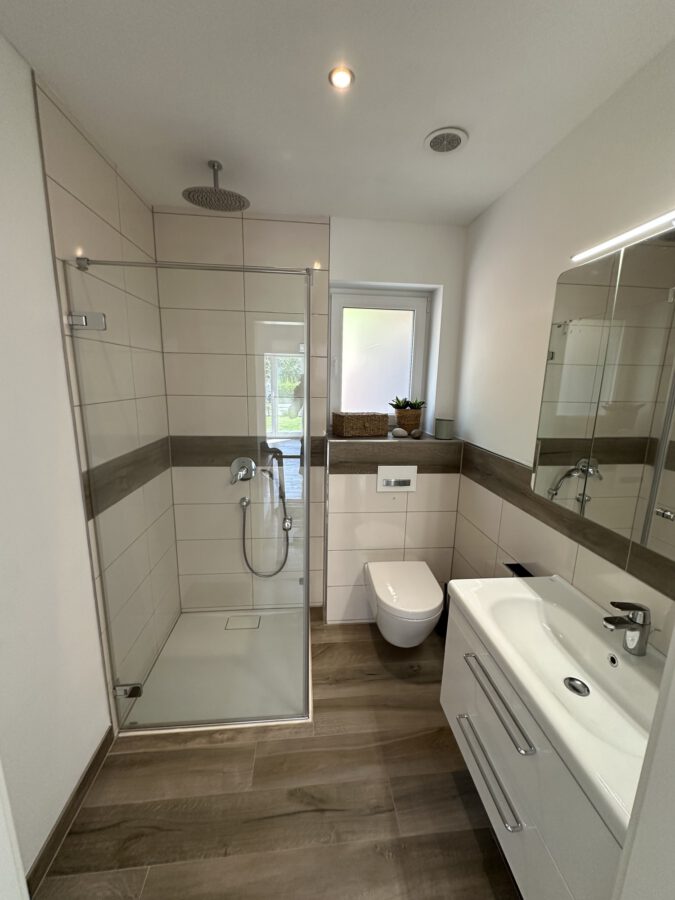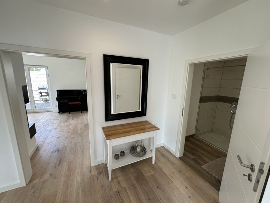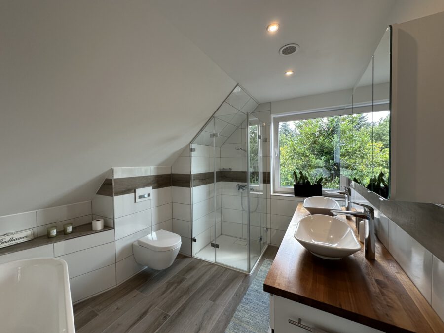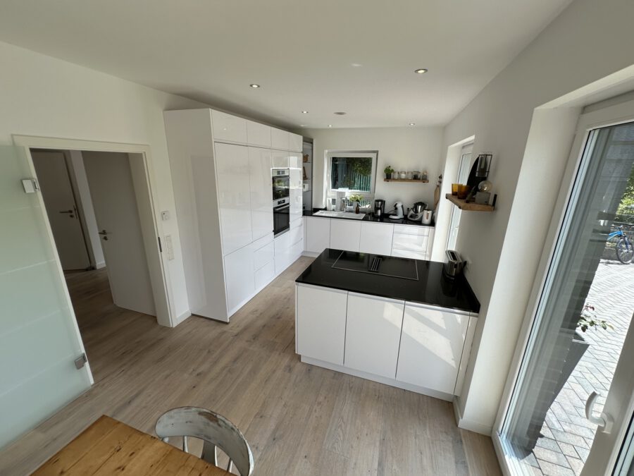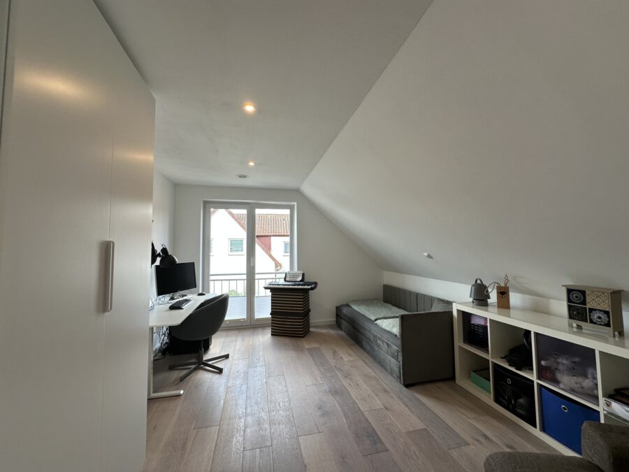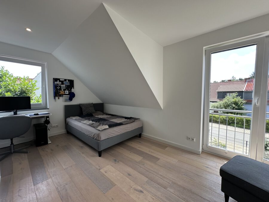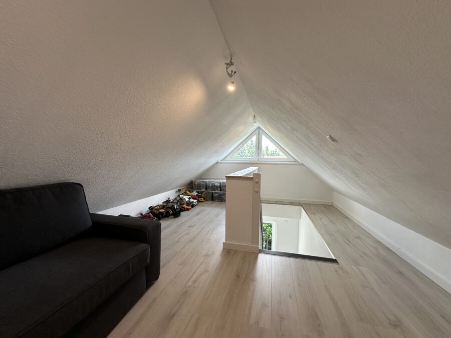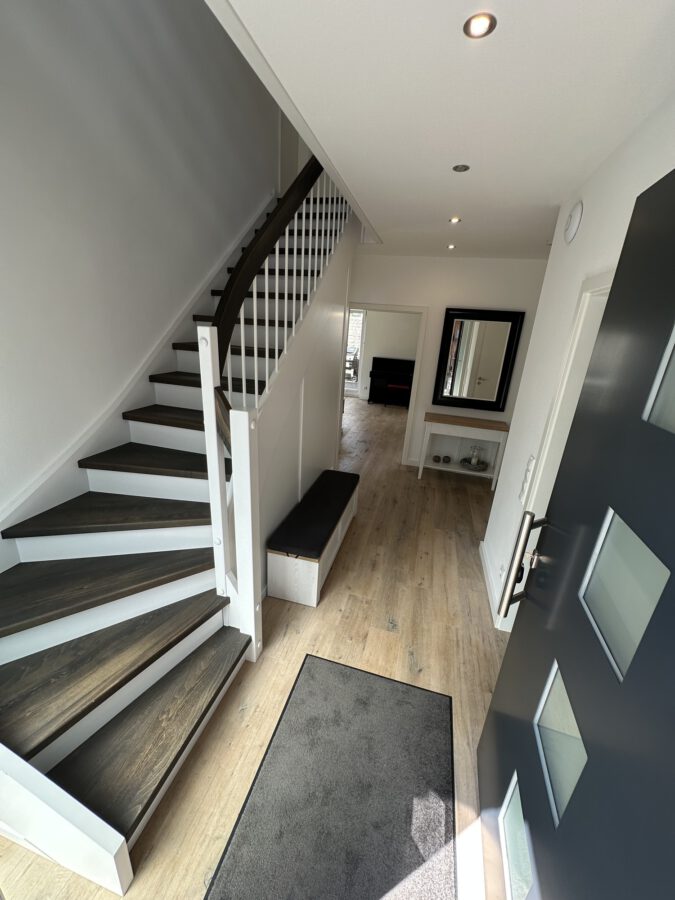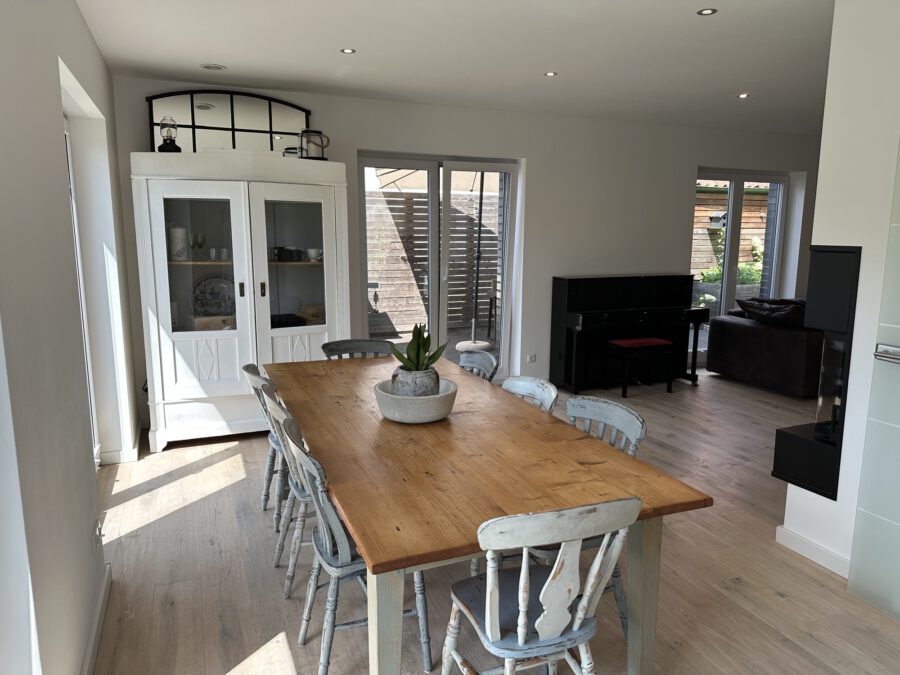 Das Haus erstreckt sich über ein Ober- und Untergeschoss mit drei großzügigen Schlafzimmern, zwei modernen Bädern, einem offenen Wohn- und Essbereich sowie einer hochwertigen Einbauküche. Zusätzlich bietet das ausgebaute Dachgeschoss einen Abstellraum, der weiteren Stauraum schafft.