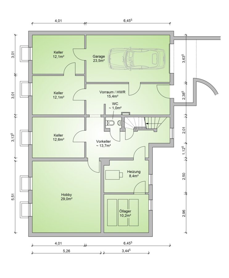 - Voll unterkellert, zusätzlich von außen begeh- und befahrbar, WC mit Waschbecken