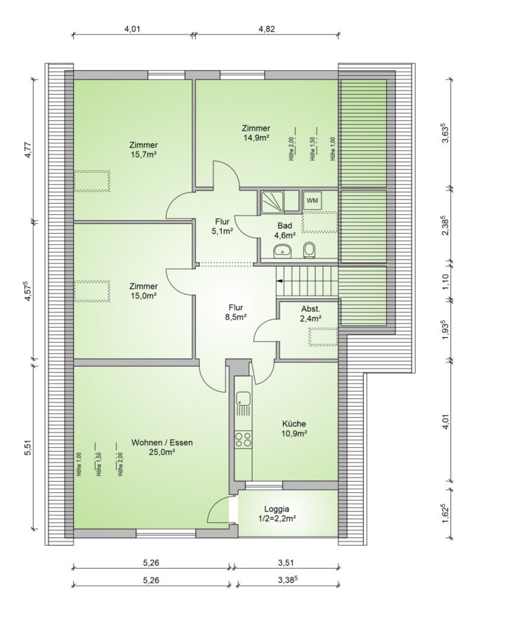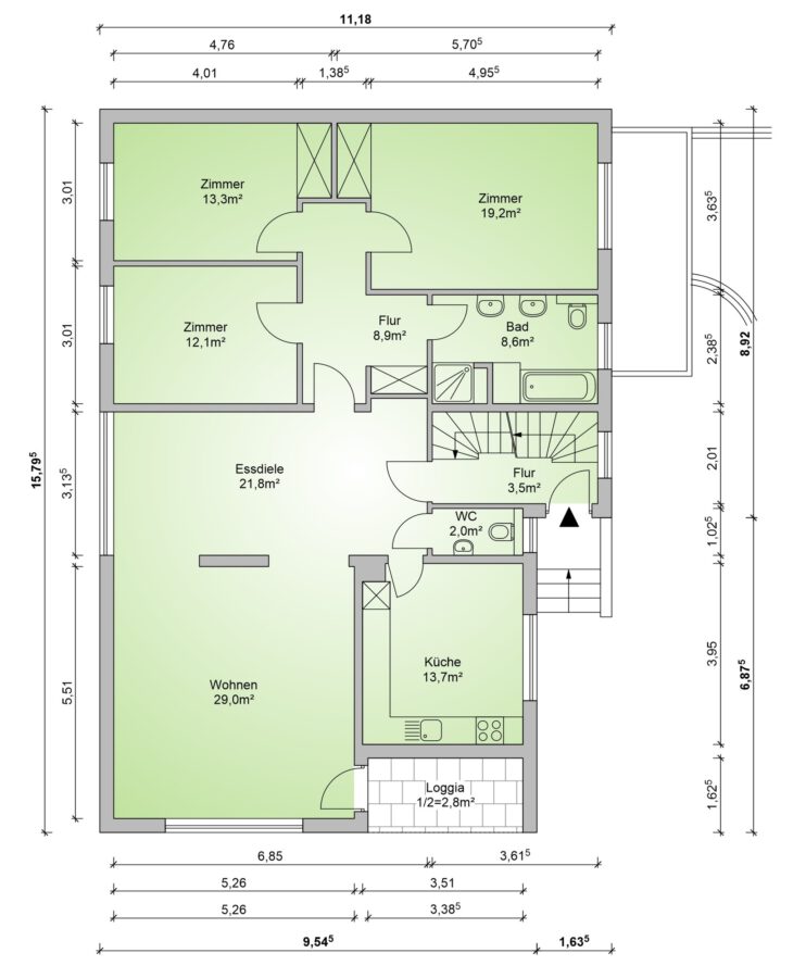 Die Immobilie verfügt über zwei großzügige Wohneinheiten. Beide Einheiten sind vollständig ausgestattet mit: jeweils vier Zimmern und einer Wohnküche mit Einbauküche sowie im Erdgeschoss mit einem Vollbad, Gäste-WC und einer Terrasse in Südlage, und im Dachgeschoss mit einem Duschbad und einer Loggia in Südlage.